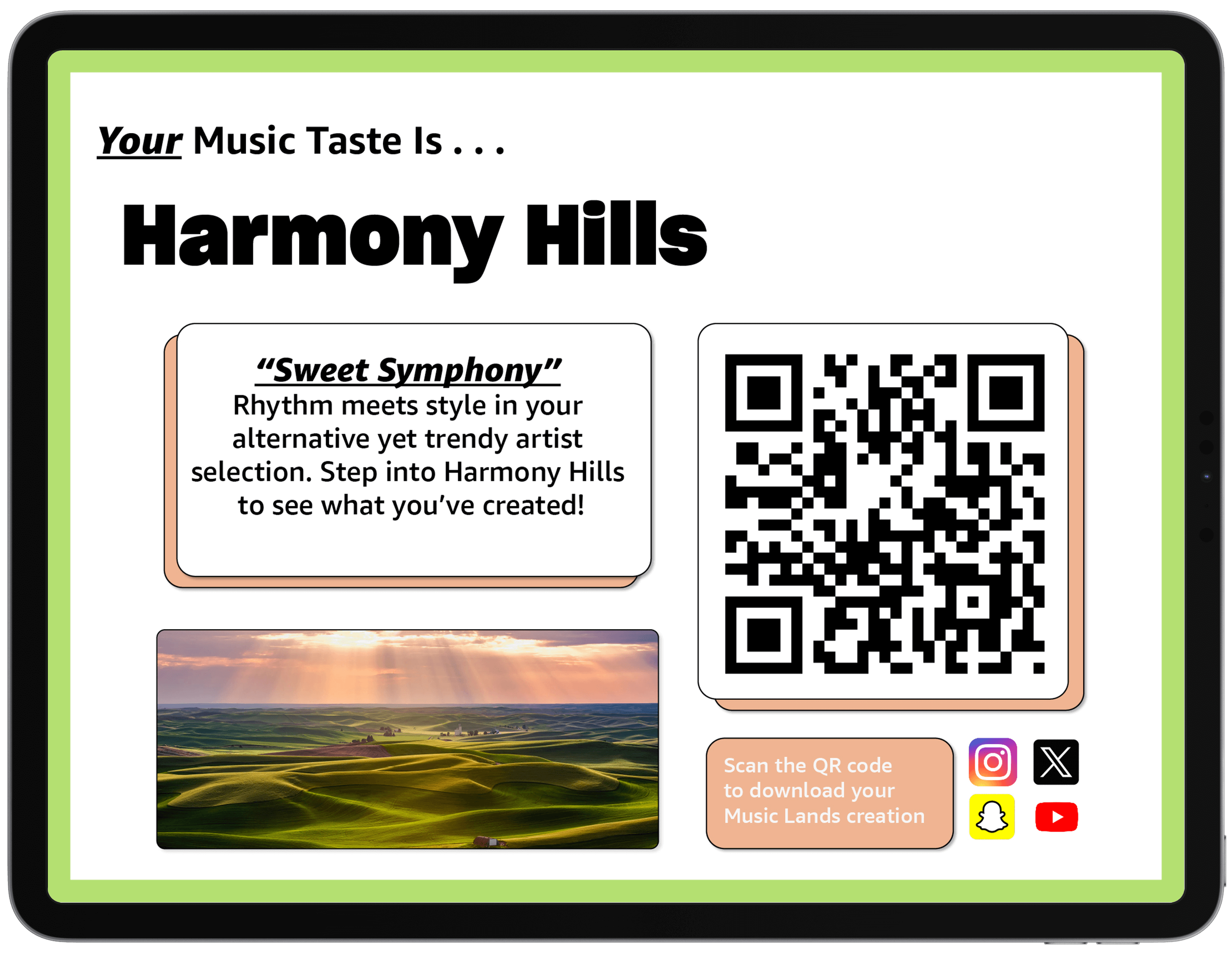 Fans would then look up from the kiosk to view an LED display with AI generated artwork. Aided by sound (ambience) and slight motion graphics, fans can take a variety of images, boomerangs, videos and more with a visual manifestation of their music taste.