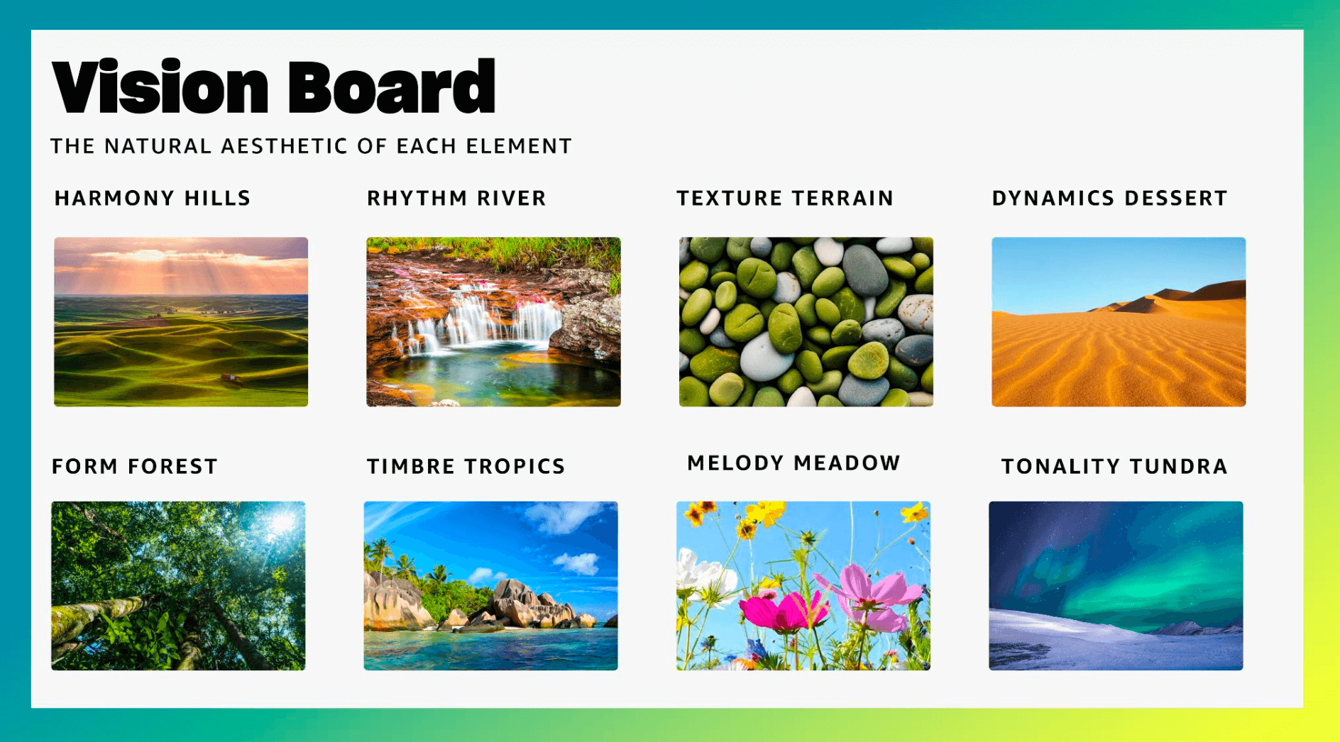 Each of the elements, such as Harmony, Rhythm, and Tonality are paired to a natural environment that matches the musical quality’s ‘feeling’.